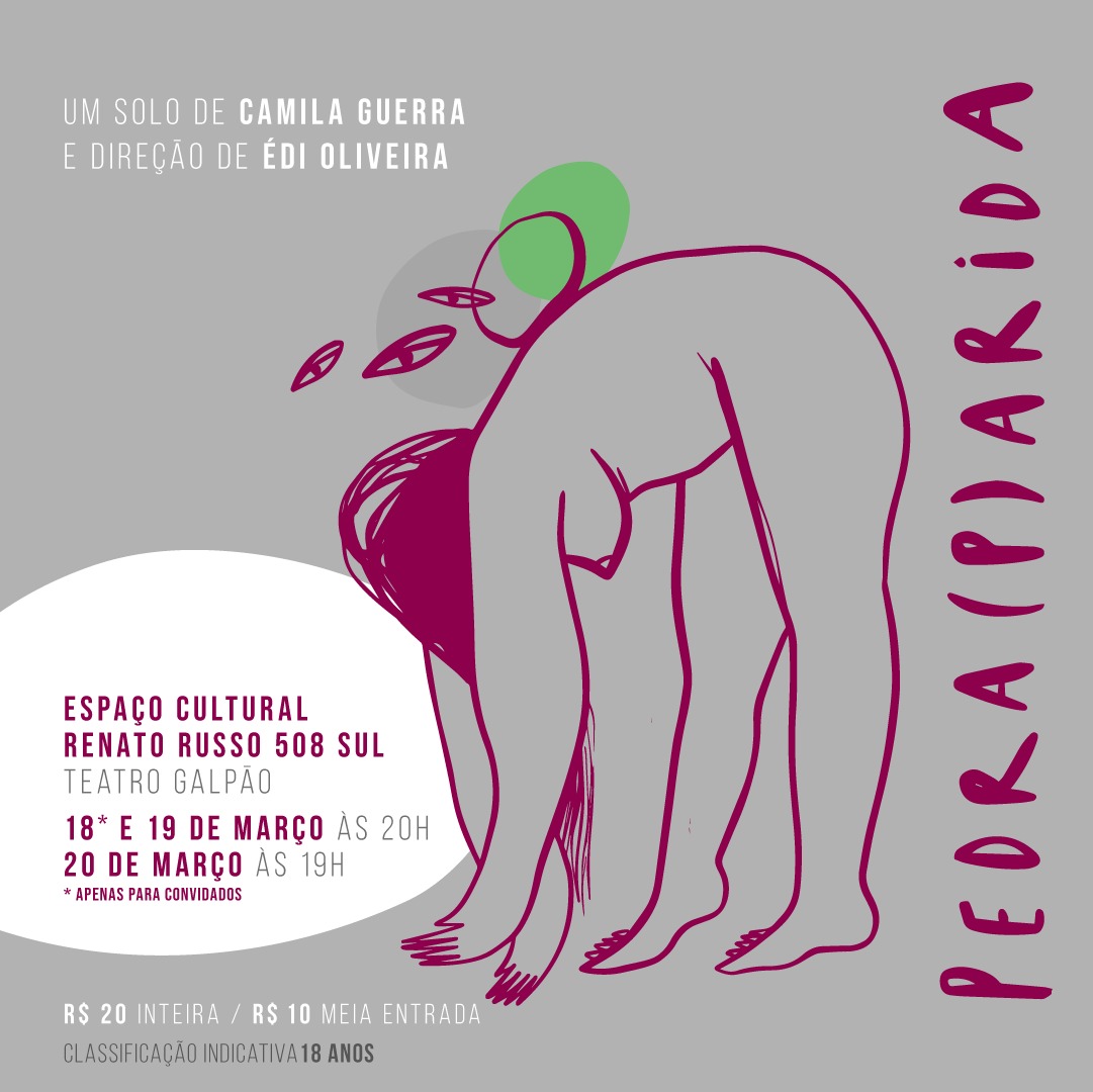 O resultado, que contou com intensos meses de trabalho e reflexões em parceria com o diretor e coreógrafo brasiliense Édi Oliveira e com a dramaturga Ana Flávia Garcia, será apresentado, agora, na peça de dança-teatro intitulada Pedra(p)Arida. O espetáculo terá estreia presencial no dia 18 de março, sexta-feira (somente para convidados), no Teatro Galpão do Espaço Cultural Renato Russo (508 sul). Nos dias 19 e 20 do mês, sábado e domingo, será aberto ao público no local. Sessões sempre às 20h. Ingressos: R$ 10 (meia-entrada). Não recomendado para menores de 18 anos. Informações: Instagram: @pedraparida.