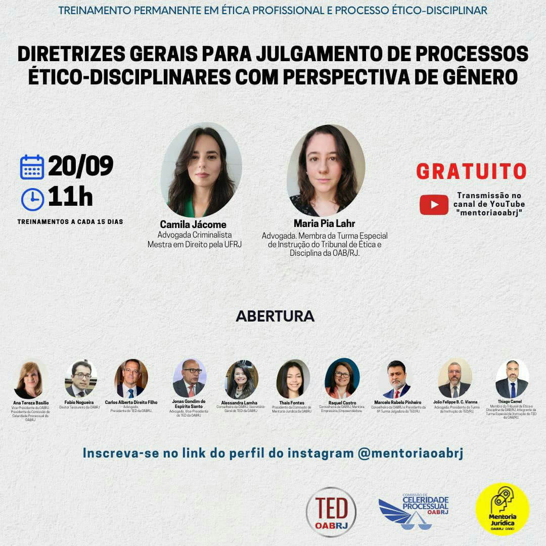 Vice-presidente da OAB-RJ, idealizadora do projeto Mentoria Jurídica e presidente da comissão de celeridade processual, Ana Tereza Basílio vai proferir a palestra de abertura, nesta sexta-feira, dia 20, às 11h, do Treinamento Permanente em Ética Profissional e Processo Ético-Disciplinar, que será transmitido pelo canal YouTube mentoriaoabrj, com o tema ” Diretrizes Gerais para julgamento de processos ético-disciplinares com perspectivas de gênero “.