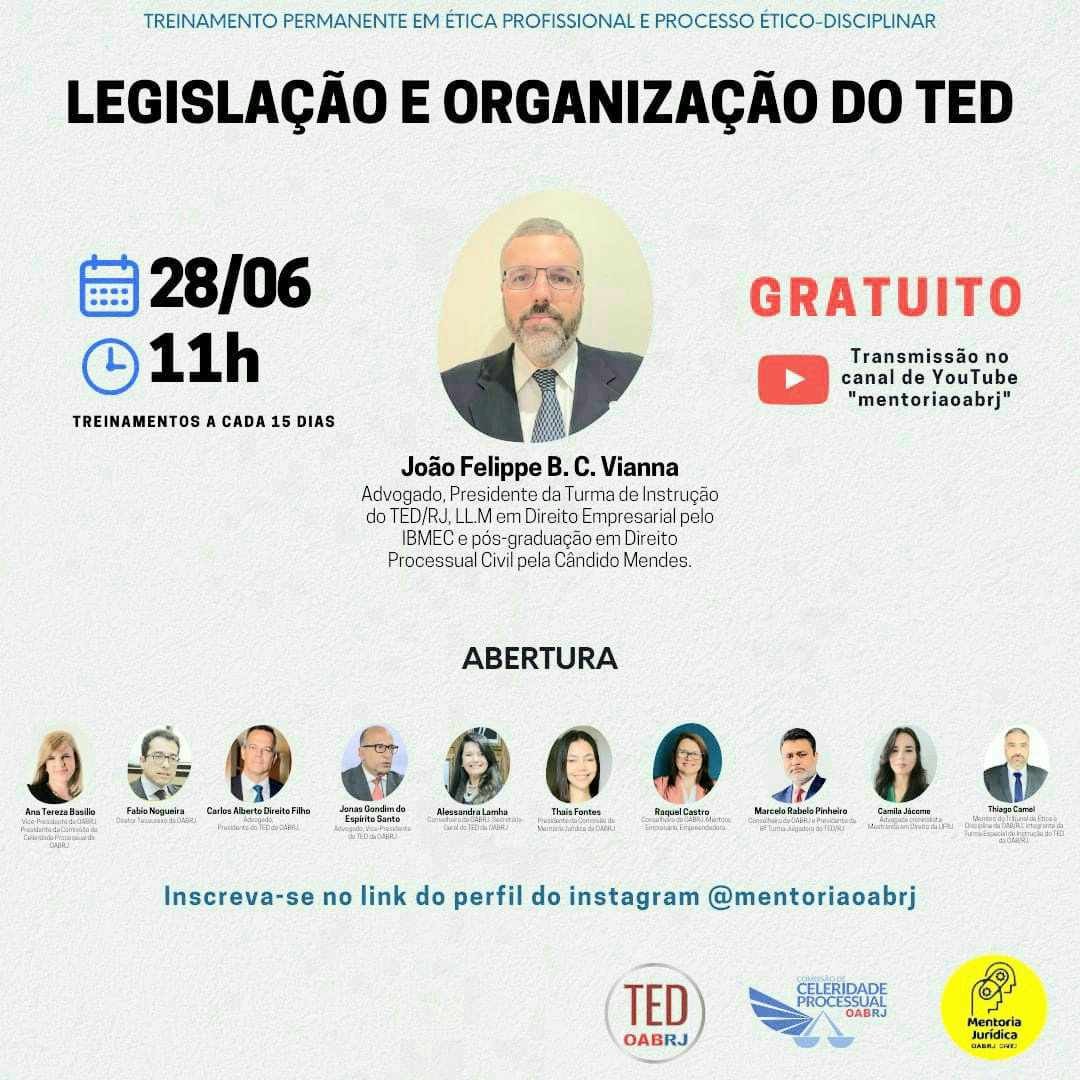 Vice-presidente da OAB-RJ e presidente da comissão de celeridade processual, Ana Tereza Basílio fará a palestra de abertura do Treinamento Permanente em Ética Profissional e Processo Ético-Disciplinar, nesta sexta, dia 28, às 11h, pelo canal YouTube mentoriaoabrj, com o tema Legislação e Organização do TED.