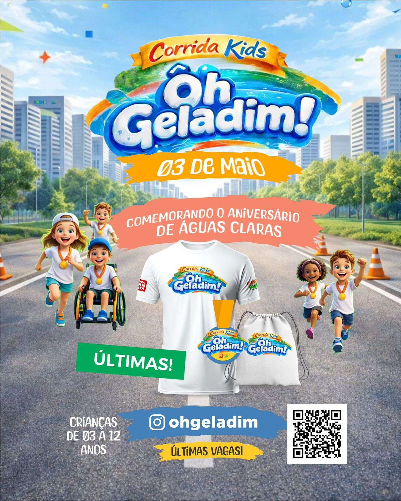 A celebração dos 23 anos de Águas Claras começa com muita energia, alegria e espírito esportivo. No dia 03 de maio, será realizada a Corrida Kids “Ôh Geladim!”, um evento especialmente dedicado às crianças de 3 a 12 anos, reunindo famílias em uma manhã de saúde, diversão e integração.