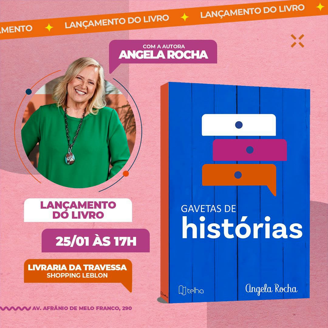 A escritora e jornalista Angela Rocha, vai lançar seu livro, “Gaveta de Histórias”, pela editora Telha e com prefácio de Carlos Eduardo Novaes, no dia 25 de janeiro, a partir das 17h, na Travessa do Shopping Leblon.