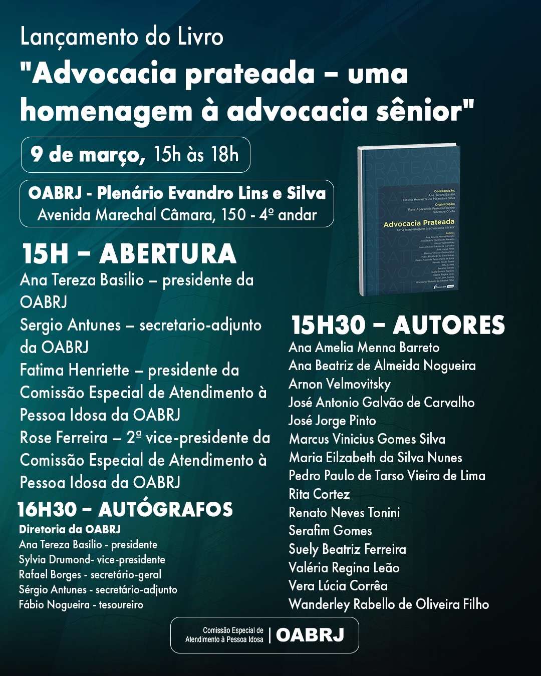Presidente da OAB-RJ, Ana Tereza Basílio vai proferir a palestra de abertura do evento de lançamento do livro ” Advocacia Prateada- Uma homenagem à advocacia sênior “, no dia 9 de março, às 15h, no Plenário Evandro Lins e Silva, com as presenças de Sergio Antunes, secretário-adjunto da seccional, da presidente da comissão especial de atendimento à pessoa idosa, Fátima Henriette, e da 2a vice-presidente, Rose Ferreira.
