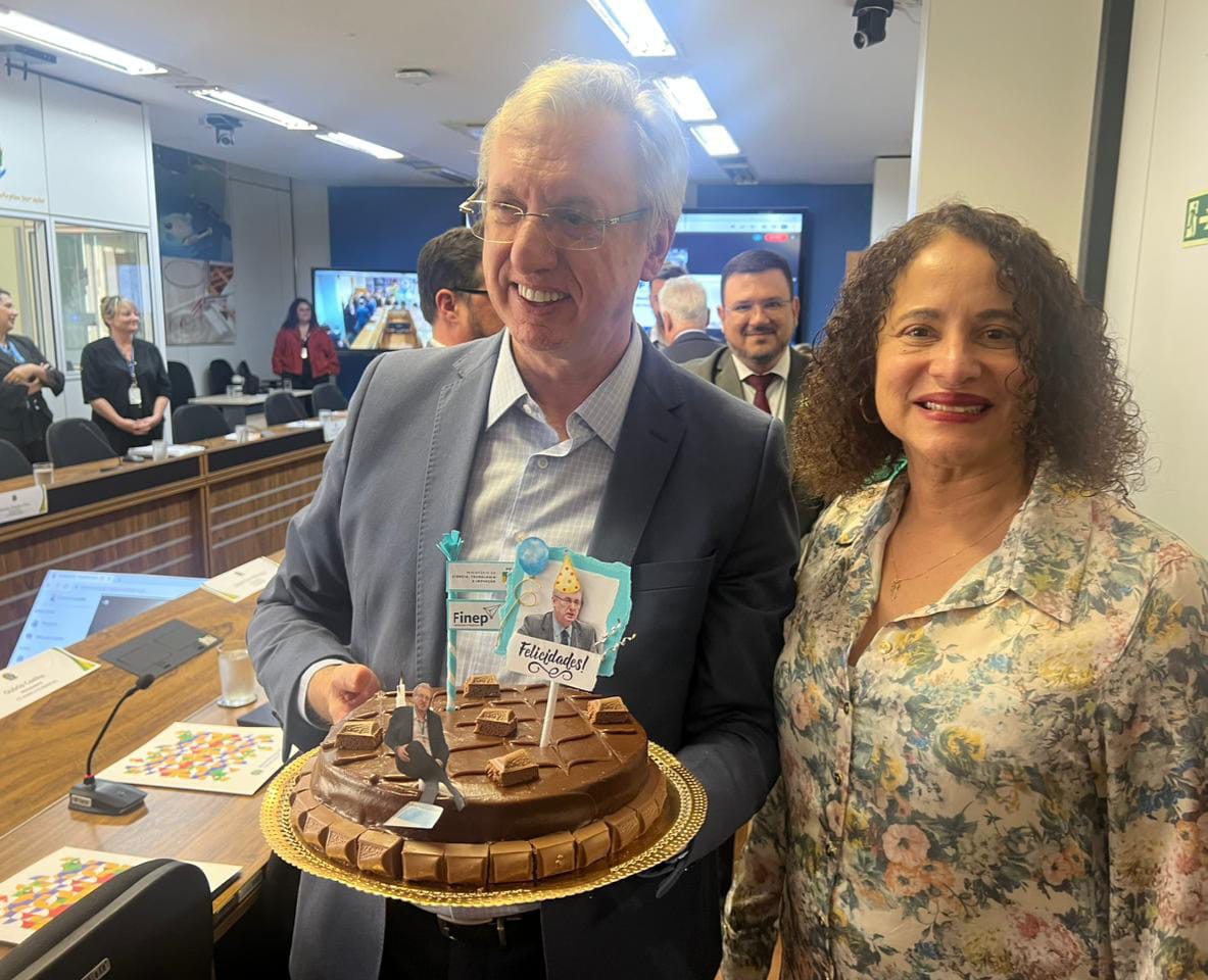 Aniversariante de outubro,  o presidente da FINEP, Celso Pansera,  recebeu homenagem da ministra Luciana Santos, da Ciência,  Tecnologia e Inovação,  com parabéns surpresa e bolo de chocolate que foi servido,  após encontro de trabalho,  na sede do Ministério.