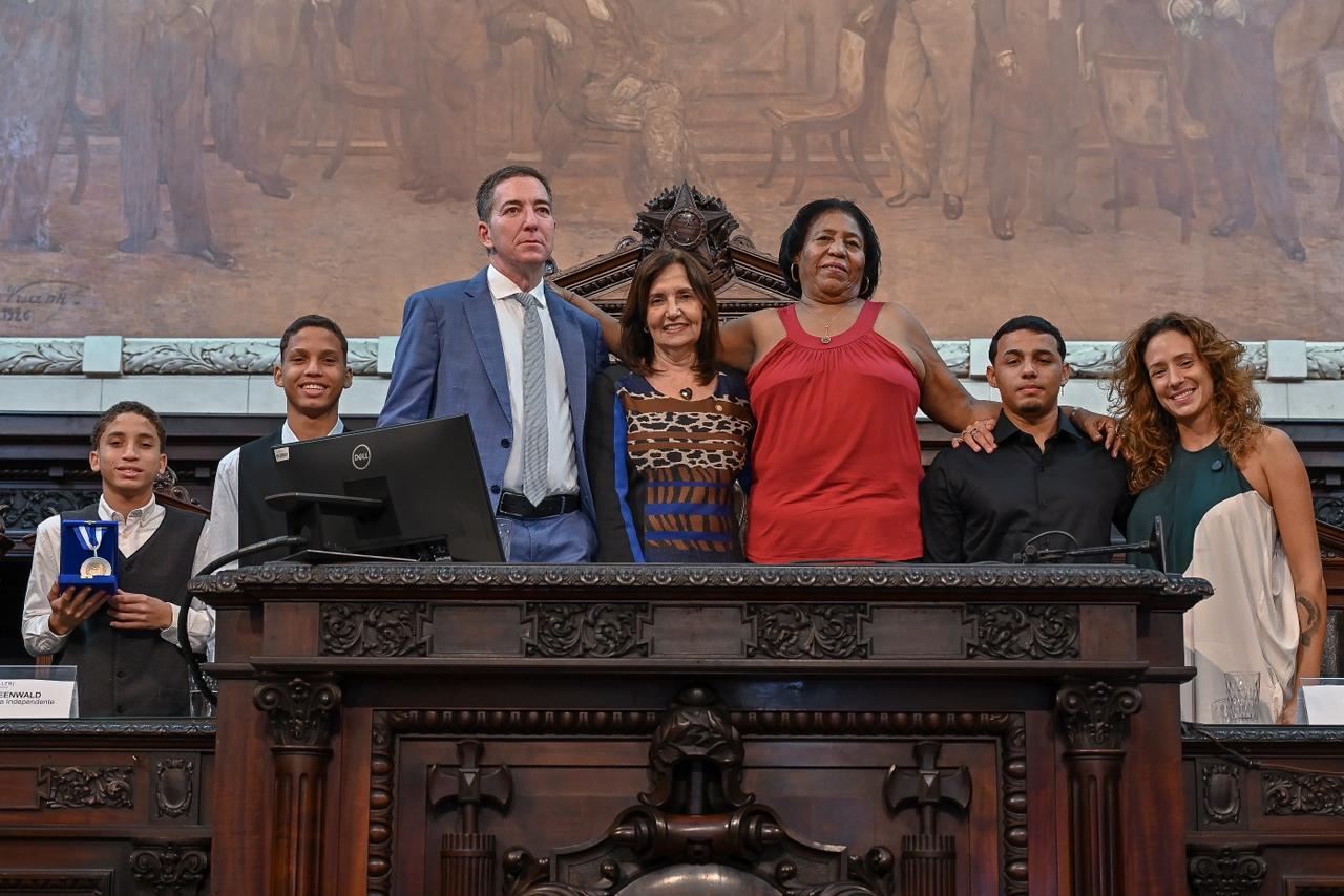 A deputada Martha Rocha,  presidente em exercício do PDT estadual, entregou a  Medalha Tiradentes (homenagem póstuma) à família do ex-deputado federal David Miranda (1985- 2023), em sessão solene, no Palácio Tiradentes.  Estavam presentes o marido e viúvo de David Miranda, o jornalista americano Gleen Greenwald, os filhos do casal,  Marcelo,  João Victor e Jonathan,  e a mãe do político e ativista, Eliane Miranda.   Também estavam lá,  o vice-presidente da Fundação Leonel Brizola, jornalista Leo Lupi,  e o advogado Thiago Veras, do PDT Diversidade.