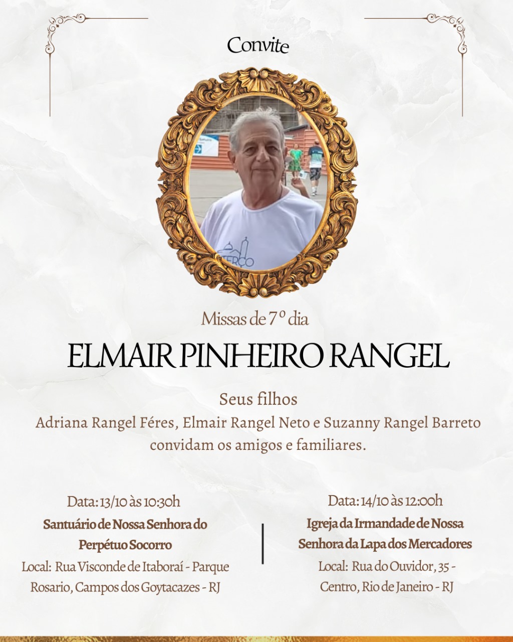 Elmair Neto, da Associação dos Dirigentes Cristãos de Empresas do Rio de Janeiro, e seus irmãos, Adriana Rangel Féres e Suzanny Rangel Barreto convidam para as missas de sétimo dia e homenagem póstuma a seu pai, Elmair Pinheiro Rangel, neste domingo, dia 13 de outubro, às 10h30, no Santuário de Nossa Senhora do Perpétuo Socorro e, no dia 14 de outubro, às 12h, na Igreja de Nossa Senhora da Lapa dos Mercadores.