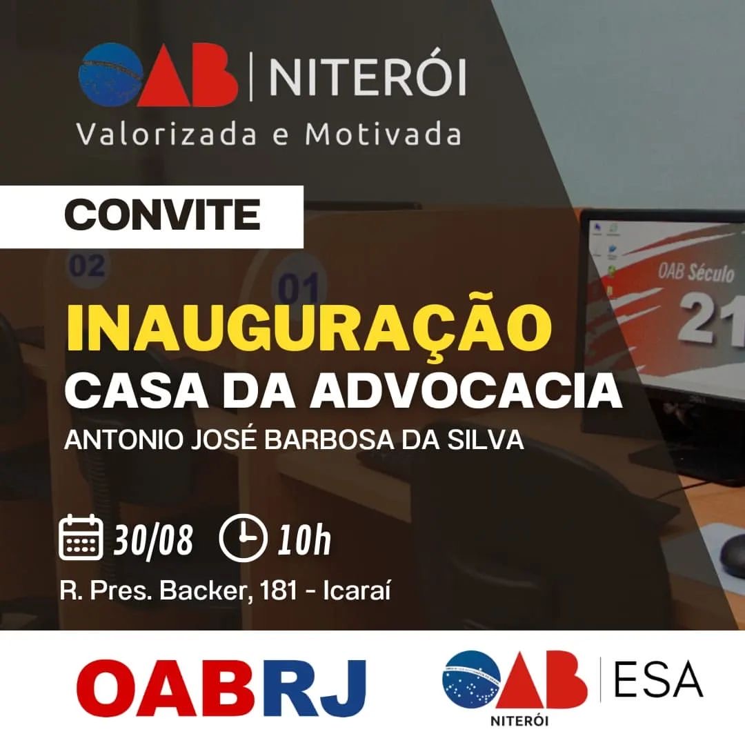Vice-presidente da OAB-RJ e presidente da comissão de celeridade processual, Ana Tereza Basílio vai participar, nesta sexta, dia 30 de agosto, às 10h, da inauguração da Casa da Advocacia da OAB de Niterói, em Icaraí, que levará o nome do ex-presidente da subseção, Antônio José Barbosa da Silva ( gestão de 2007 a 2018).