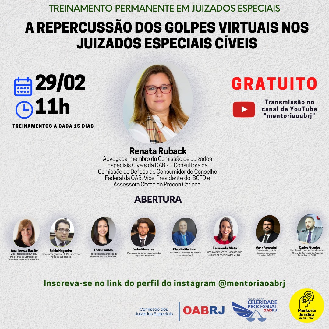 Também estarão no encontro virtual, o procurador-geral da OAB-RJ, Fabio Nogueira, a presidente da comissão de Mentoria Jurídica, Thais Fontes, o presidente da comissão de Juizados Especiais, Pedro Menezes, e os advogados Renata Ruback, Claudio Marinho, Fernanda Mata, Mano Fornaciari e Carlos Guedes.