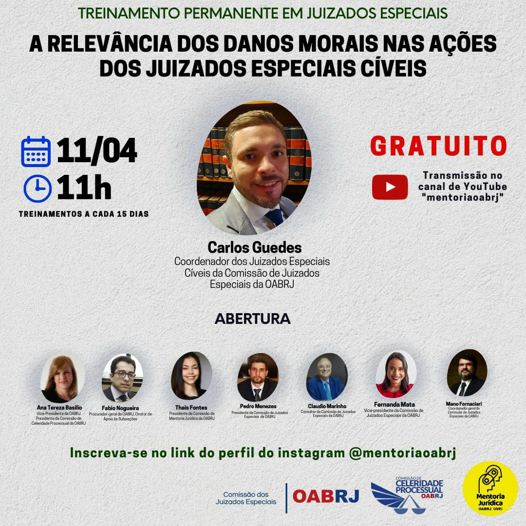 Idealizadora do projeto Mentoria, vice-presidente da OAB-RJ e presidente da comissão de celeridade processual, Ana Tereza Basilio é a convidada do Treinamento Permanente em Juizados Especiais, nesta quinta-feira, dia 11, às 11h, pelo canal YouTube mentoriaoabrj, com o tema “A relevância dos danos morais nas ações dos juizados especiais cíveis”.