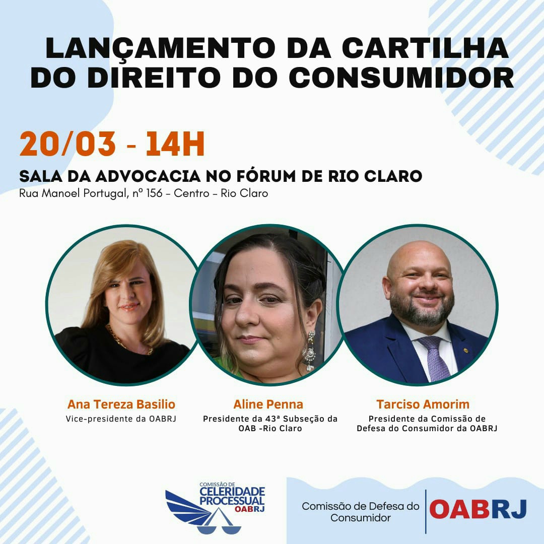 Também estarão no evento presencial, o presidente da comissão de Direito do Consumidor da OAB-RJ, Tarciso Amorim, e a presidente da OAB de Rio Claro, Aline Penna.