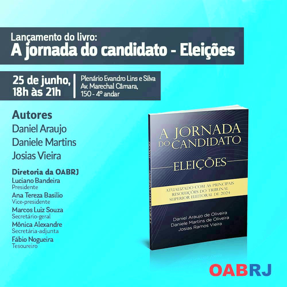 Vice-presidente da OAB-RJ e presidente da comissão de celeridade processual, Ana Tereza Basílio vai participar, nesta terça-feira, dia 25, às 18h, no Plenário Evandro Lins e Silva ( sede da seccional), do Lançamento do livro ” A jornada do candidato- Eleições “, de Daniel Araújo, Daniele Martins e Josias Vieira ( foto)