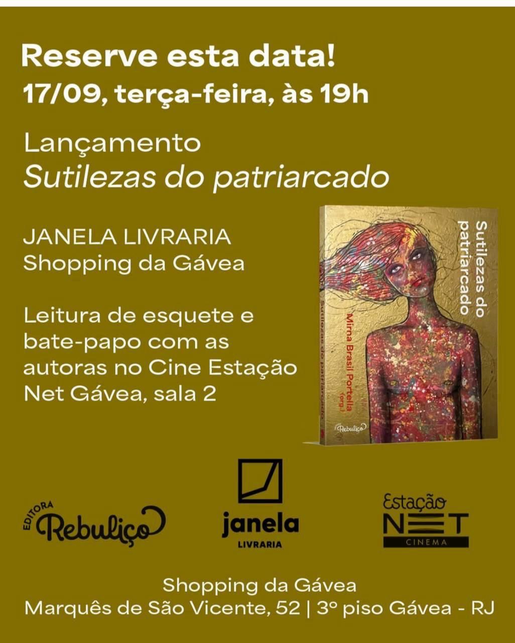 A escritora Mirna Brasil Portella lançará,  no dia 17 de setembro,  às 19h, na Janela,  livraria do Shopping da Gávea, junto com Dilea Frate, Dani Balbi,  Fernanda Nobre,  Cláudia Mauro,  Lucia Tucuju, Anna Cláudia Ramos,  Cláudia Nina,  Danielle Schlossarek, Inês Garçoni, Isabelle Borges,  Isadora Wikinson, Leila Meireles,  Luana Rodrigues,  Luísa Benevides, Mia Lima Rocha , Thais Velloso ( nomes confirmados para a noite de autógrafos) o livro ” Sutilezas do Patriacardo “.