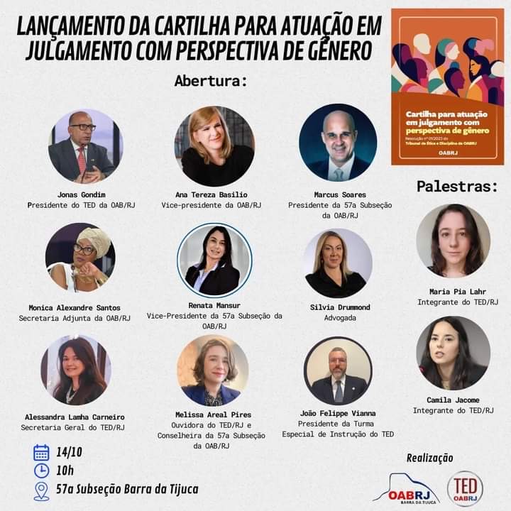 Vice-presidente da OAB-RJ e presidente da comissão de celeridade processual, Ana Tereza Basílio vai proferir a palestra de abertura da solenidade de lançamento da ” Cartilha para atuação em julgamento com perspectiva de gêner “, na próxima segunda-feira,  dia 14 de outubro,  às 10h,  no auditório da OAB da Barra da Tijuca.  O evento é promovido pelo Tribunal de Ética e Disciplina da seccional do Rio de Janeiro.