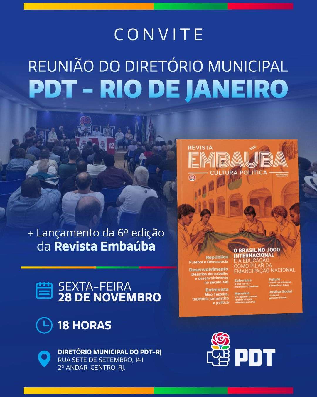 Presidente do PDT municipal e Subsecretário de Assistência Social do Município do Rio de Janeiro, Leo Lupi convida para o lançamento da 6a edição da Revista Embaúba,  nesta sexta-feira, dia 28 de novembro,  às 18h, na sede do PDT municipal,  na Rua 7 de setembro 141, segundo andar, Centro do Rio.