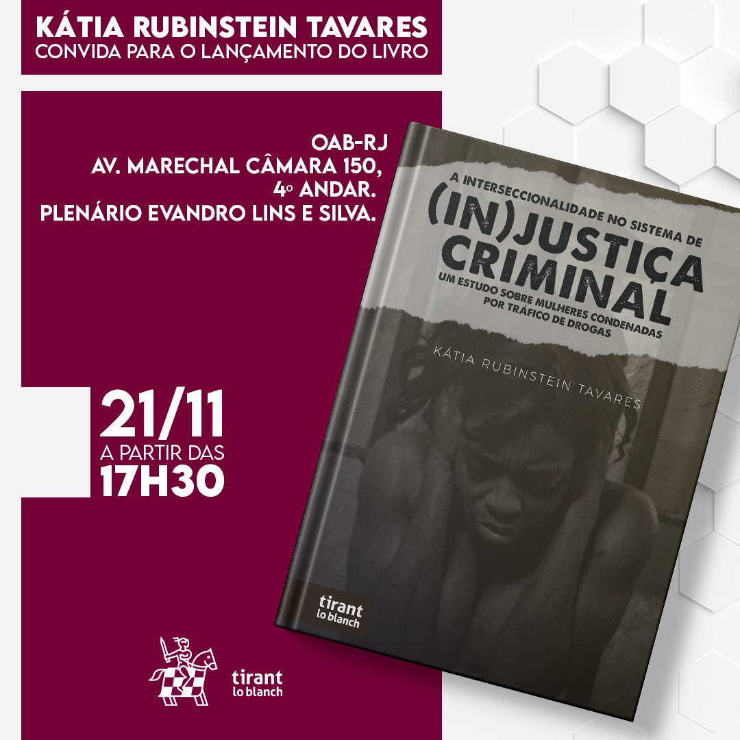 A advogada Kátia Rubinstein Tavares lança seu livro, ” A Intercionalidade no sistema de (In) Justiça Criminal- Um estudo sobre mulheres condenadas por tráfico de drogas “, nesta quarta-feira, dia 21 de novembro, às 17h30, no Plenário Evandro Lins e Silva, na sede da OAB-RJ.