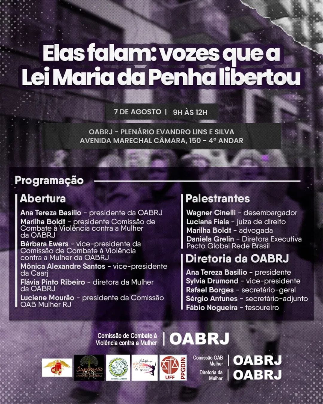 Também vão participar do evento de abertura, a presidente da comissão de Combate à Violência contra a Mulher da OAB-RJ, Marilha Boldt, a vice-presidente da comissão, Bárbara Ewers, a vice-presidente da Caarj, Mônica Alexandre, a diretora da Mulher da OAB-RJ, Flávia Pinto Ribeiro, e a presidente da comissão OAB Mulher RJ, Luciane Mourão.