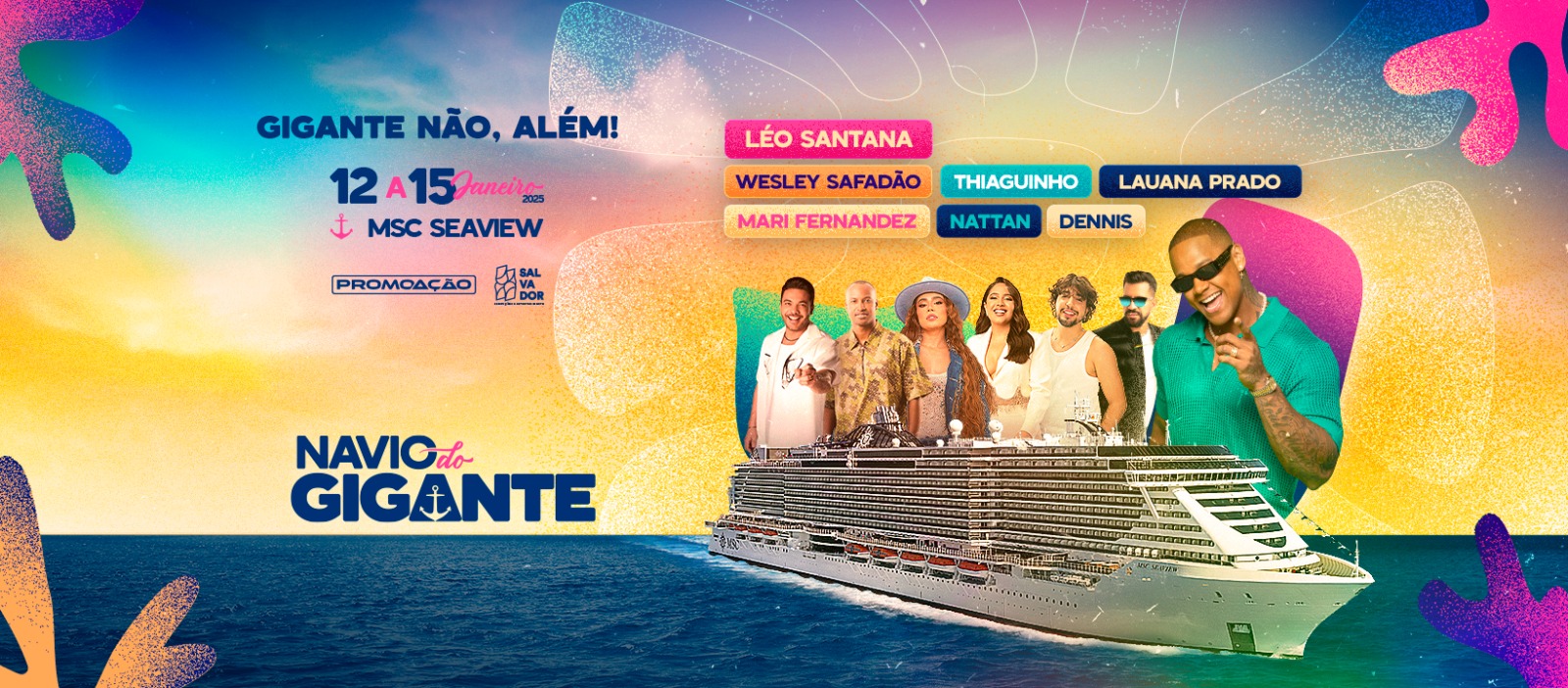 A primeira edição do “Navio do Gigante” já tem data para acontecer e promete agitar as águas do oceano a bordo do MSC Seaview. De 12 a 15 de Janeiro, o GG da Bahia comandará a festa ao lado de Lauana Pradro, Wesley Safadão, Nattanzinho, Thiaguinho, Mari Fernandez e Dennis DJ que farão seus respectivos shows em alto mar.