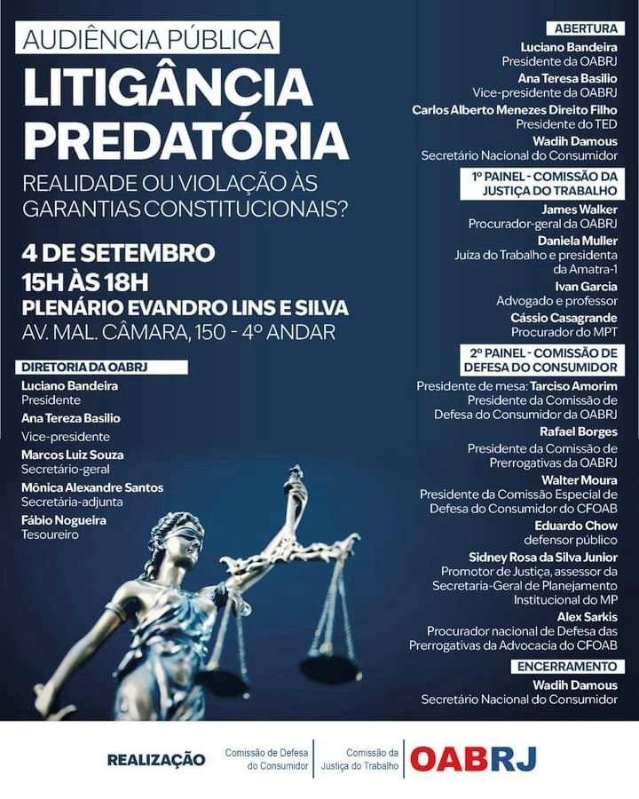 Também estarão no evento promovido pelas comissões de Defesa do Consumidor e de Justiça do Trabalho,  o presidente Tribunal de Ética e Disciplina da OAB-RJ,  Carlos Alberto Direito Filho,  o secretário Nacional do Consumidor,  Wadih Damous, o advogado Tarciso Amorim,  entre outros convidados.
