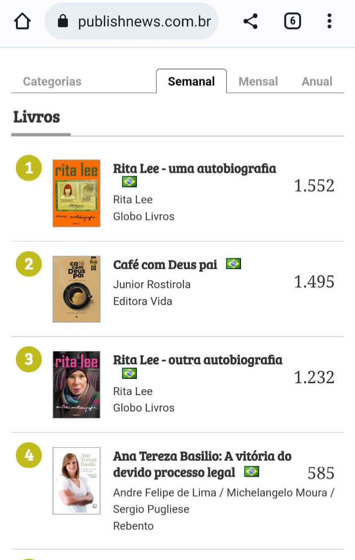 O livro sobre a trajetória de Ana Tereza Basilio está em quarto lugar, atrás de Rita Lee, outra autobiografia, “Café com Deus Pai” e “Rita Lee – uma autobiografia”.