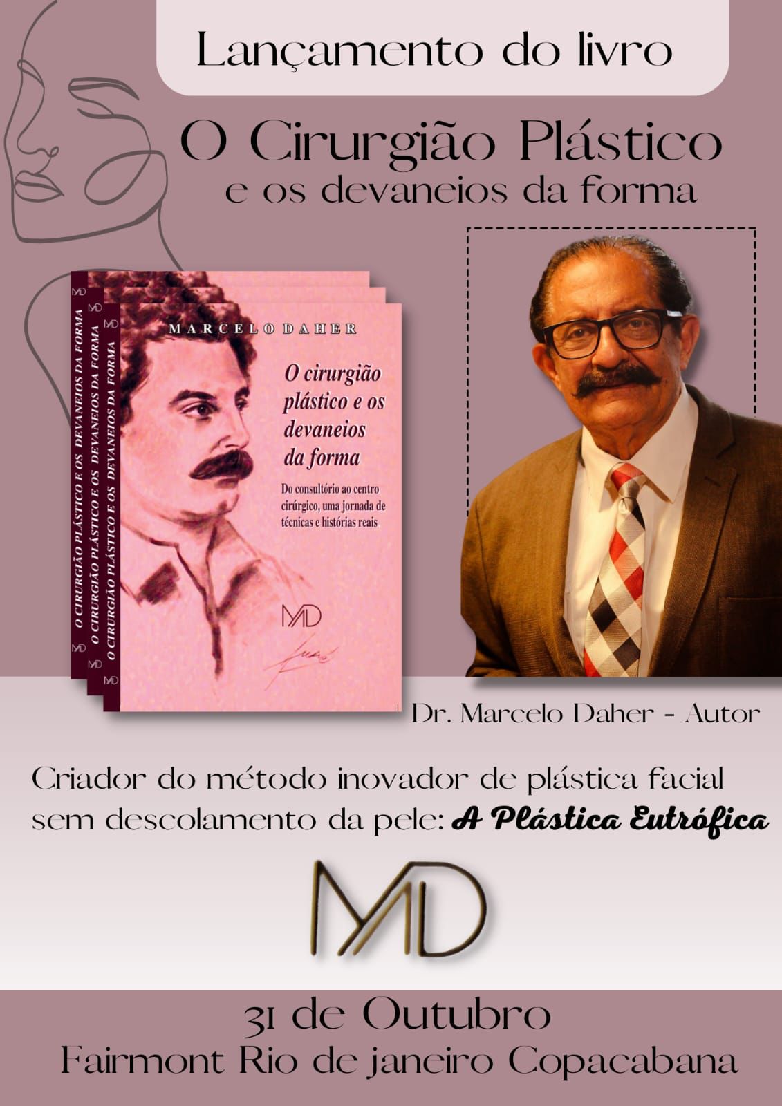 Pensando nesses aspectos, o cirurgião plástico Marcelo Daher, lança no dia 31 de outubro, o livro “O cirurgião plástico e os devaneios da forma”. O lançamento acontecerá no Hotel Fairmont, em Copacabana, na Zona Sul do Rio. Na obra, o experiente cirurgião plástico, criador do método inovador de plástica facial sem descolamento de pele, a “Plástica Eutrófica”, apresenta de forma didática possibilidades de tratamentos e considerações sobre as diversas áreas da cirurgia plástica, tanto no campo físico quanto no campo fisiológico do entendimento do comportamento humano.