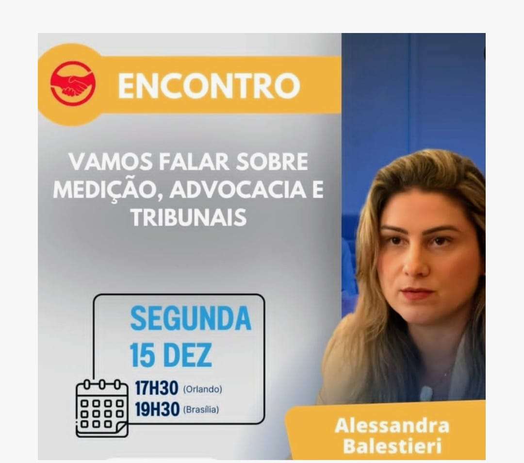 A advogada Alessandra Balestieri vai palestrar sobre Mediação, Advocacia e Tribunais,  nesta segunda-feira,  às 19h30 (horário de Brasília) e às 17h30 (horário de Orlando), no Encontro,  promovido pelo Centro de Desenvolvimento das Práticas de Mediação (AMBRA Mediation).
