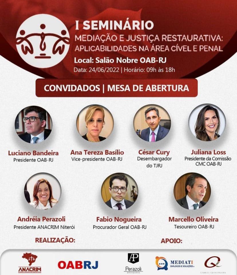 Vice-presidente da OAB-RJ, Ana Tereza Basílio faz a abertura, nesta sexta-feira, 24, das 9h às 18h, junto com Luciano Bandeira, presidente da seccional, do I Seminário “Mediação e Justiça Restaurativa: Aplicabilidades nas áreas cível e penal”, que acontece no Salão Nobre da OAB-RJ.
