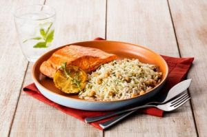 Salmão grelhado com arroz e grão-de-bico al limone