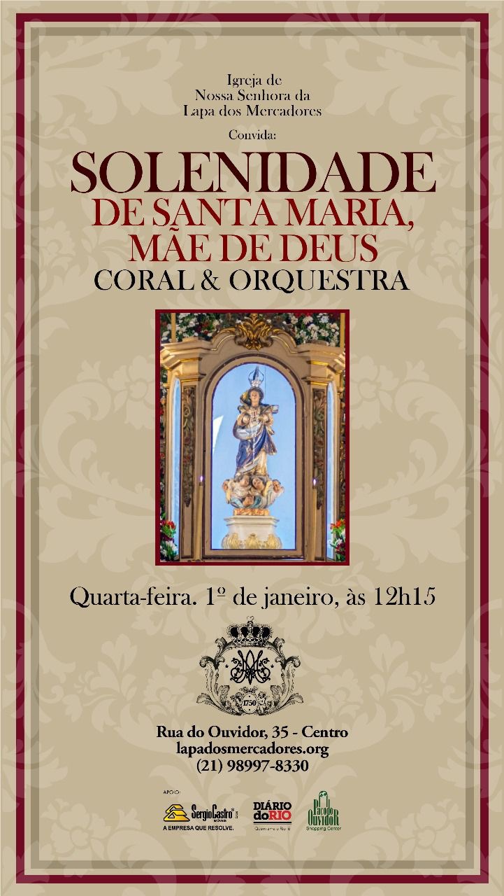 Comissário administrativo da Irmandade de Nossa Senhora da Lapa dos Mercadores, o empresário e provedor Claudio André Castro convida para a Missa de Ano Novo,  a Santa Missa da Solenidade de Santa Maria Mãe de Deus,  com Coral e Orquestra,  nesta quarta,  dia primeiro de janeiro,  às 12h15.