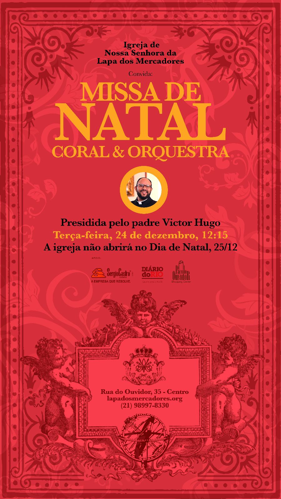 Provedor da Irmandade de Nossa Senhora da Lapa dos Mercadores, Claudio André Castro, convida para a Missa de Natal, no dia 24 de dezembro, terça-feira, às 12h15, na igrejinha da rua do Ouvidor 35.