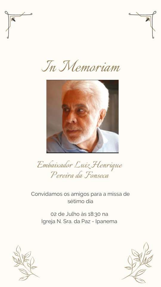 família do querido Embaixador Luiz Henrique Pereira da Fonseca ( que morreu, na semana passada ) convida para a Missa de Sétimo Dia, nesta terça-feira, dia 2 de julho, às 18h30, na igreja de Nossa Senhora da Paz, em Ipanema.
