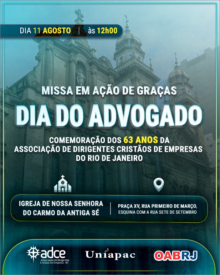 Nesta segunda-feira, dia 11 de agosto, às 12h,  a presidente da OAB,  Ana Tereza Basílio, e o presidente da Uniapac Adce’Rio, Elmair Neto,  participam da Missa em Ação de Graças,  respectivamente, pelo Dia do Advogado,  e em comemoração aos 63 anos da Associação dos Dirigentes Cristãos de Empresa , na igreja de Nossa Senhora do Carmo da Antiga Sé,  às 12h, na Praça XV (Rua Primeiro de Março,  esquina com a 7 de setembro)