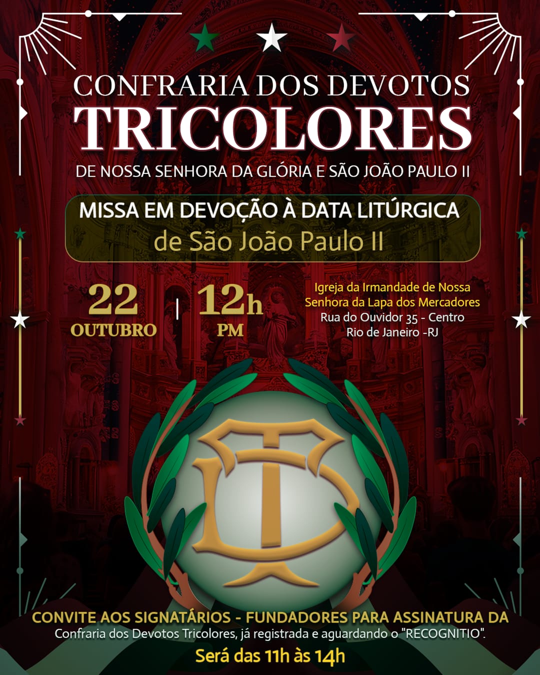 A Irmandade de Nossa Senhora da Lapa dos Mercadores convida para a Missa em Devoção à Data Litúrgica de São João Paulo II, nesta terça-feira,  às 12h,  na igrejinha da rua do Ouvidor 35 .