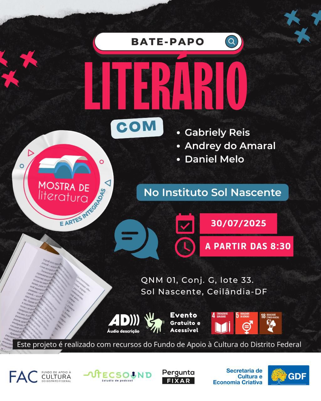 A 11ª Mostra oferece nesta edição dez episódios de podcasts dedicados exclusivamente ao universo do livro, da leitura, das bibliotecas e da contação de histórias. As apresentações artísticas e bate-papos literários acontecem nas regiões administrativas de Itapoã, Sol Nascente, Estrutural e Paranoá – ampliando o alcance da ação e reforçando seu compromisso com a democratização do acesso à cultura. A primeira apresentação será no Instituto Sol Nascente, Ceilândia-DF. As próximas terão a programação divulgada no Instagram da Pergunta Fixar.
