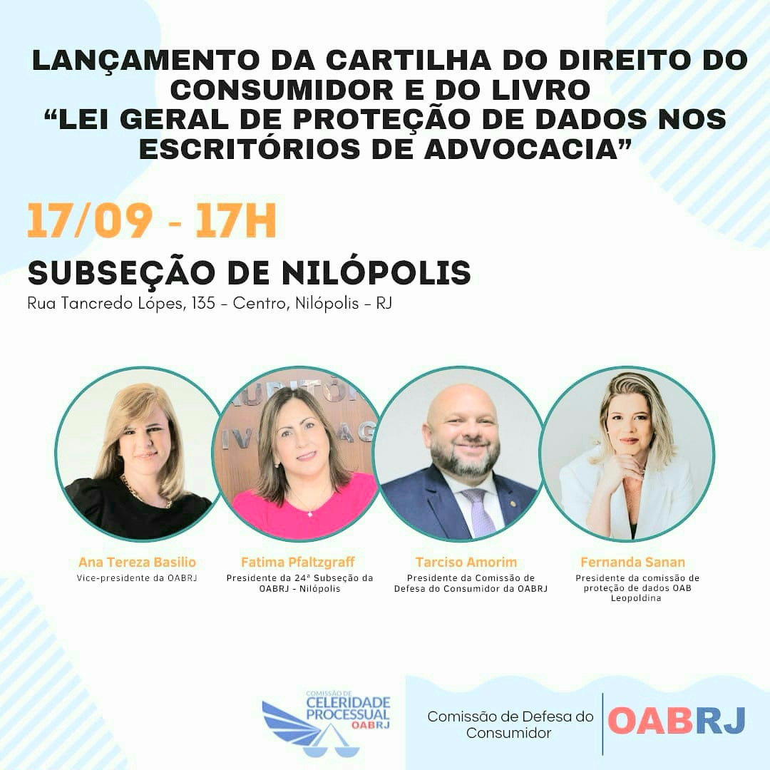 Vice-presidente da OAB-RJ e presidente da comissão de celeridade processual,  Ana Tereza Basílio vai proferir a palestra de abertura da solenidade de lançamento da Cartilha do Direito do Consumidor é do livro “Lei Geral de Proteção de Dados nos Escritórios de Advocacia “, nesta terça-feira,  dia 17 de setembro,  às 17h, na subseção de Nilópolis. O evento é promovido pelas comissões de Celeridade Processual e de Defesa do Consumidor da seccional do Rio de Janeiro..  também estarão no evento presencial,  a presidente da OAB de Nilópolis,  Fátima Pfaltzgraff,  o presidente da comissão de Defesa do Consumidor,  Tarciso Amorim,  e a presidente da comissão de Proteção de Dados da OAB Leopoldina, Fernanda Sanan.