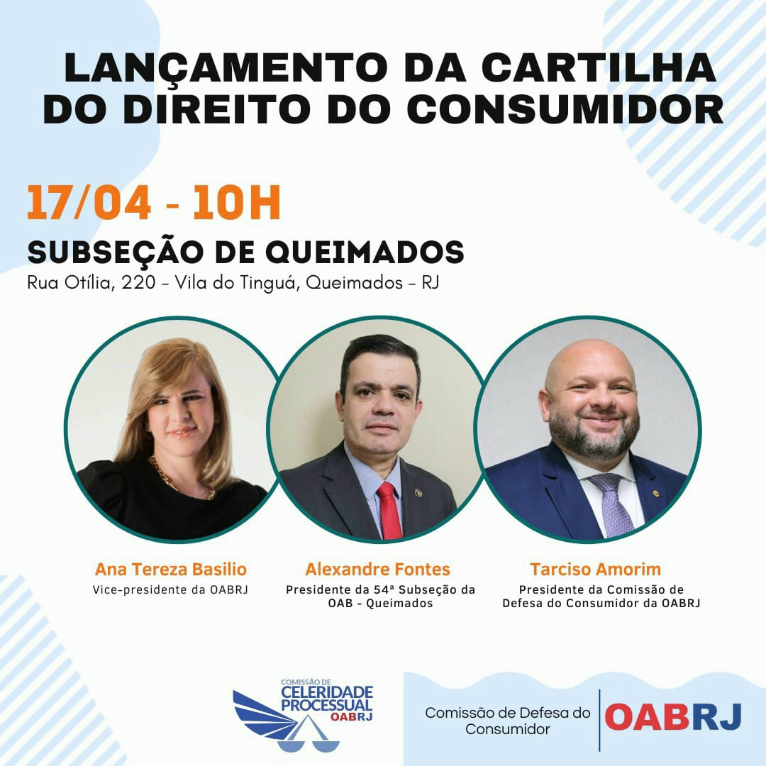 Também estarão no evento presencial, o presidente da OAB de Queimados, Alexandre Fontes, e o presidente da comissão de Defesa do Consumidor, Tarciso Amorim.