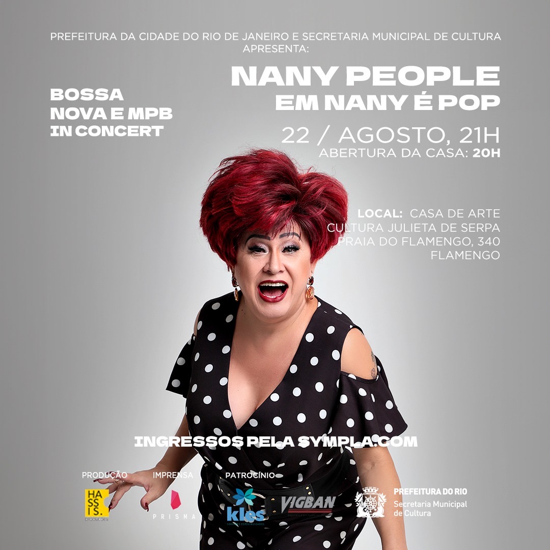 Dirigida por Beth Serpa e Carlos Alberto Serpa, a Casa Julieta de Serpa (Praia do Flamengo número 340) vai receber, nesta quinta-feira, dia 22 de agosto, a partir das 20h (abertura da casa e show, às 21h), o show de Nany People, em Nany é Pop, no Bossa Nova in Concert, com o apoio da Prefeitura do Rio de Janeiro e da Secretaria Municipal de Cultura.