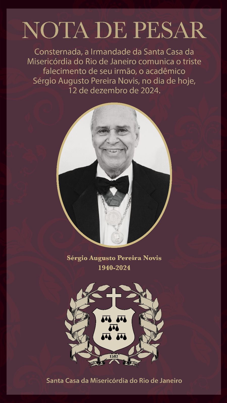 Provedor da Irmandade, Francisco Horta, e o Mordomo da Santa Casa da Misericórdia, Claudio André Castro, lamentaram a morte do neurologista Sergio Augusto Novis, aos 84 anos, na última quinta-feira, dia 12 de dezembro.