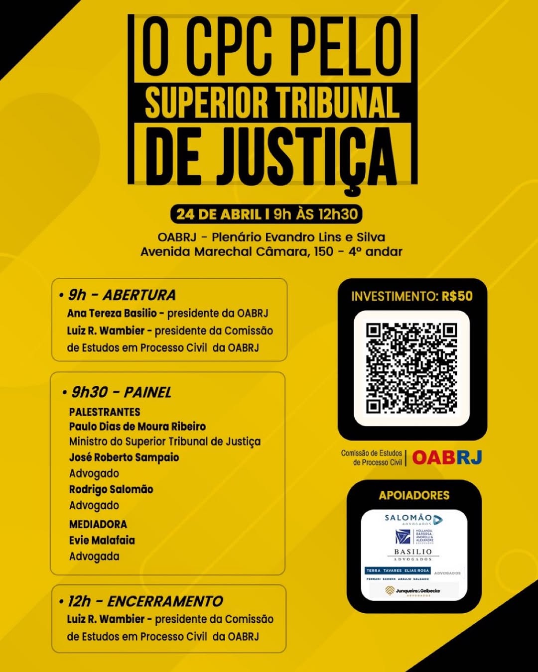 Também estará na abertura do encontro presencial, o presidente da comissão de Estudos em Processo Civil da OAB-RJ, Luiz Wambier, entre outros convidados.