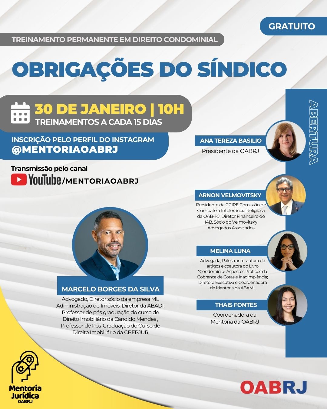 Também estarão no encontro virtual e gratuito, o presidente da comissão de Combate à Intolerância Religiosa, Arnon Velmovitsky, a Coordenadora da Mentoria da OAB-RJ, Thais Fontes, a advogada Melina Luna e o advogado Marcelo Borges da Silva.