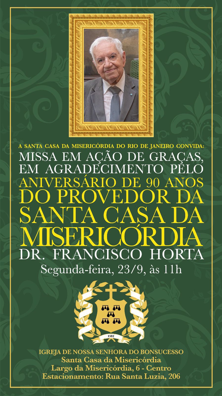 Em homenagem pelos 90 anos de Francisco Horta, nesta segunda-feira, dia 23, às 11h, será celebrada, na igreja de Nossa Senhora do Bonsucesso (Largo da Misericórdia), missa em ação de graças, com as presenças de inúmeros amigos do juiz, ex-deputado e ex-presidente do Fluminense, entre eles, o mordomo da Santa Casa da Misericórdia, Claudio André Castro, o ex-deputado Mauro Magalhães, a advogada advogada Regina Costa e Wagner Victer.