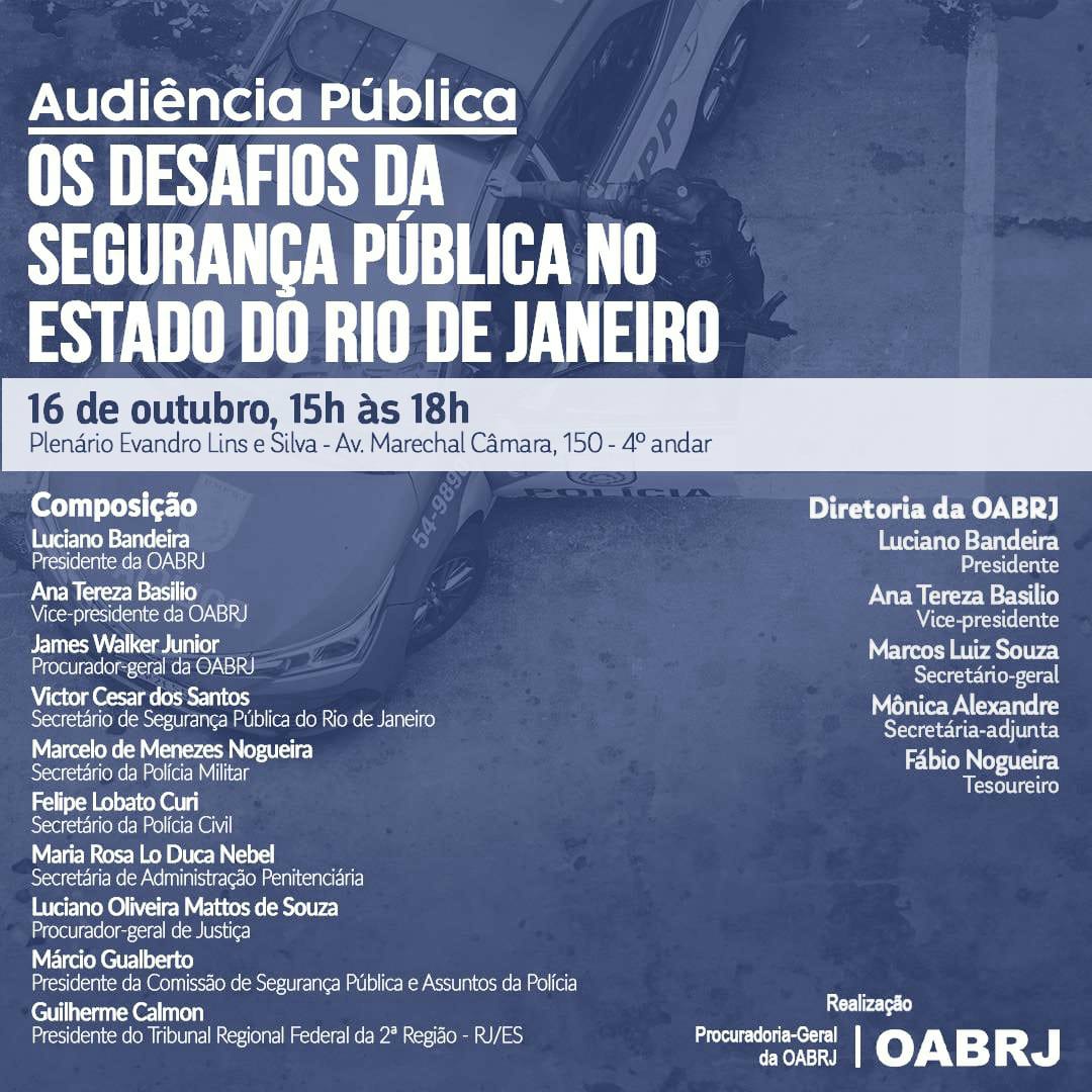 Vice-presidente da OAB-RJ e presidente da comissão de celeridade processual, Ana Tereza Basílio vai proferir a palestra de abertura, junto com o presidente da seccional, Luciano Bandeira, nesta quarta-feira, dia 16 de outubro, às 15h, no Plenário Evandro Lins e Silva, na Audiência Pública com o tema ” Os Desafios da Segurança Pública no Estado do Rio de Janeiro “. O evento é promovido pela Procuraria- Geral da OAB-RJ.