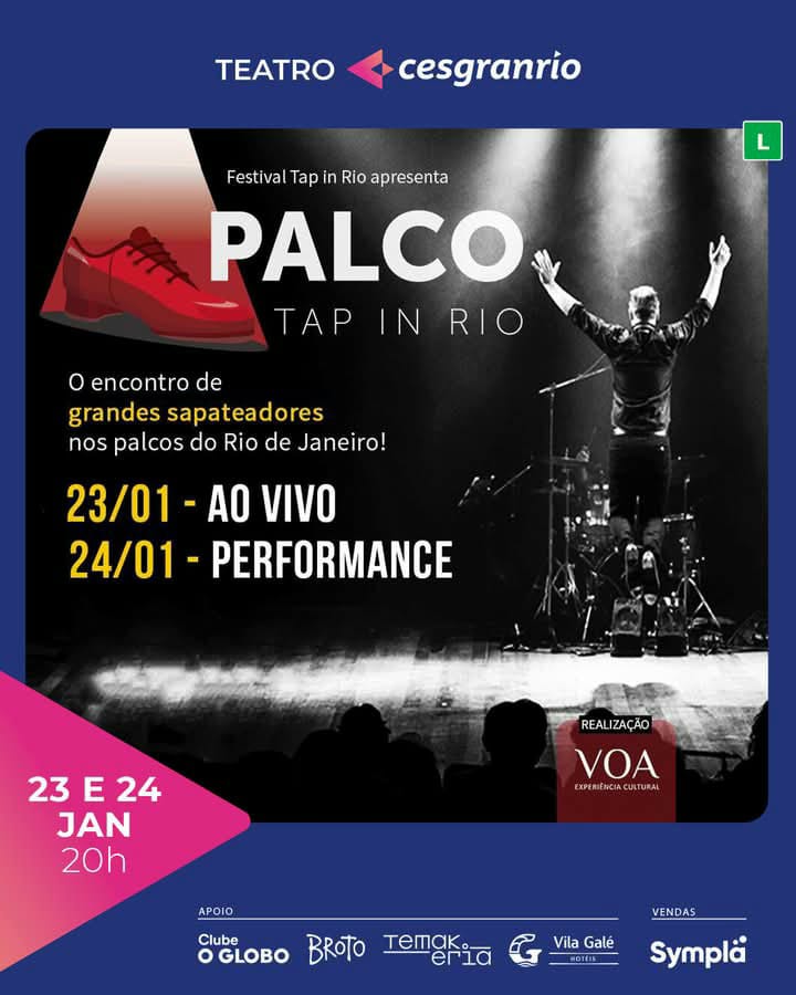 Criado por Carlos Alberto Serpa, o Teatro Cesgranrio (Rua Santa Alexandrina número 1011, Rio Comprido) vai receber, nesta quinta-feira, dia 23, e na sexta-feira, dia 24 de janeiro, às 20h, o Tap in Rio, festival de sapateado americano criado por Steven Harper e Adriana Salomão, em 2002, e que, atualmente, reúne os melhores profissionais do mundo e alunos, em torno de aulas, apresentações, mesas-redondas e outras atividades.