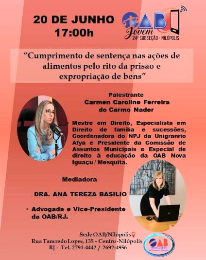 Também vai participar do encontro presencial, a presidente da comissão de Assuntos Municipais e Especial de Direito à Educação da OAB de Nova Iguaçu/Mesquita, Carmen Ferreira do Carmo Nader, especialista em Direito de Família.