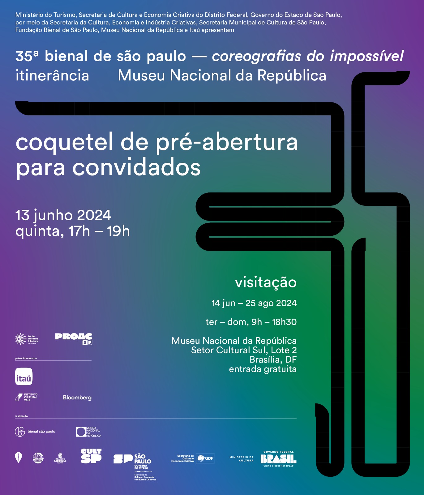 A Secretaria de Cultura e Economia Criativa do Distrito Federal (SECEC-DF) e a Fundação Bienal de São Paulo levam para o Museu Nacional da República uma seleção especial da 35ª Bienal de São Paulo – coreografias do impossível. Com curadoria de Diane Lima, Grada Kilomba, Hélio Menezes e Manuel Borja-Villel, a exposição, bem-sucedida em 2023 em termos de público e crítica, estará em exibição em Brasília de 13 de junho a 25 de agosto.