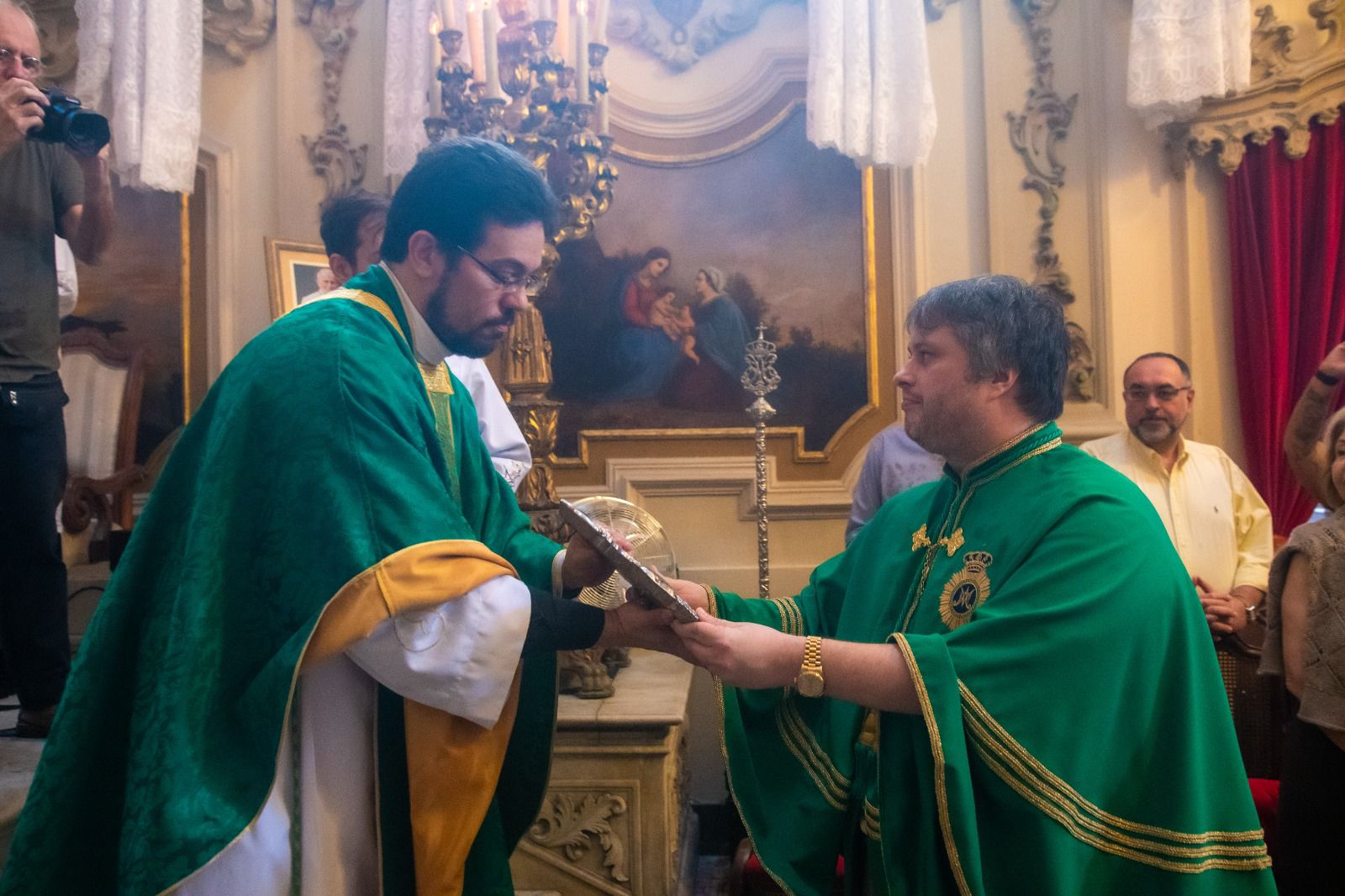 Provedor da Irmandade de Nossa Senhora da Lapa dos Mercadores e diretor da Sergio Castro Imóveis, o empresário Claudio André Castro homenageou, na missa em ação de graças, celebrada para comemorar a devolução das peças sacras da igrejinha da rua do Ouvidor, desaparecidas há 50 anos, a Polícia Federal e os órgãos do patrimônio histórico, representados, respectivamente, pela delegada Paula Mary e pelo superintendente do Iphan, Paulo Vidal, pelo empenho na devolução dos objetos históricos, recuperadas no início da semana. Crédito das fotos; Daniel Martins.