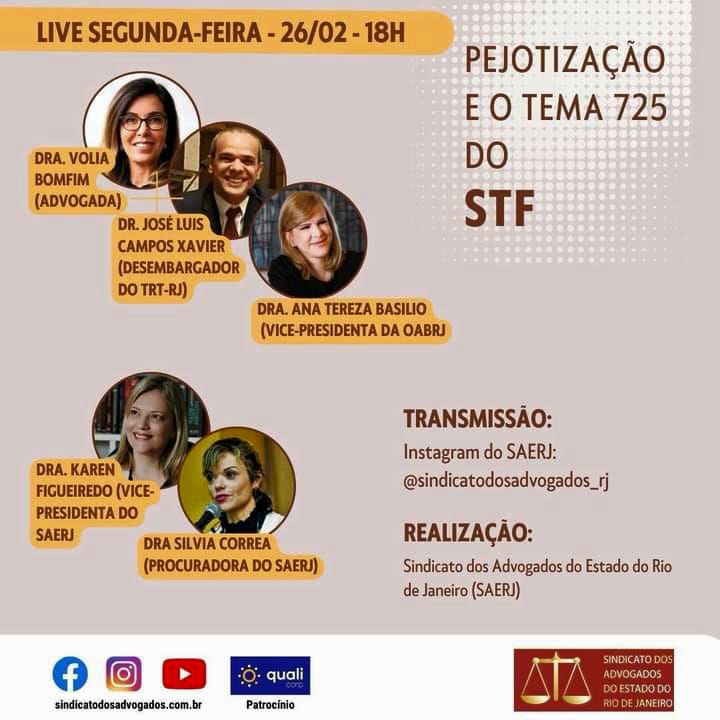 Vice-presidente da OAB-RJ e presidente da comissão de celeridade processual, Ana Tereza Basilio vai participar nesta segunda-feira, dia 26 de fevereiro, às 18h, pelo Instaram do Sindicato dos Advogados do Estado do Rio de Janeiro (SAERJ), @sindicatodosadvogados_rj , da live com o tema  Pejotização e o tema 725 do STF.