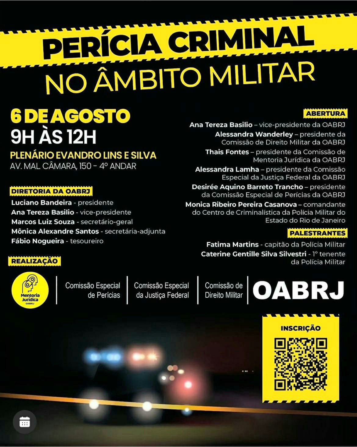 Também estarão no encontro presencial, a presidente da comissão de Direito Militar da OAB-RJ, Alessandra Wanderley, a presidente da comissão de Mentoria Jurídica, Thaís Fontes, a presidente da comissão especial de Justiça Federal, Alessandra Lamha, a presidente da comissão especial de Perícias, Desirée Aquino Barreto Trancho, e a comandante do Centro de Criminalistica da Polícia Militar do Rio de Janeiro, Monica Casanova.