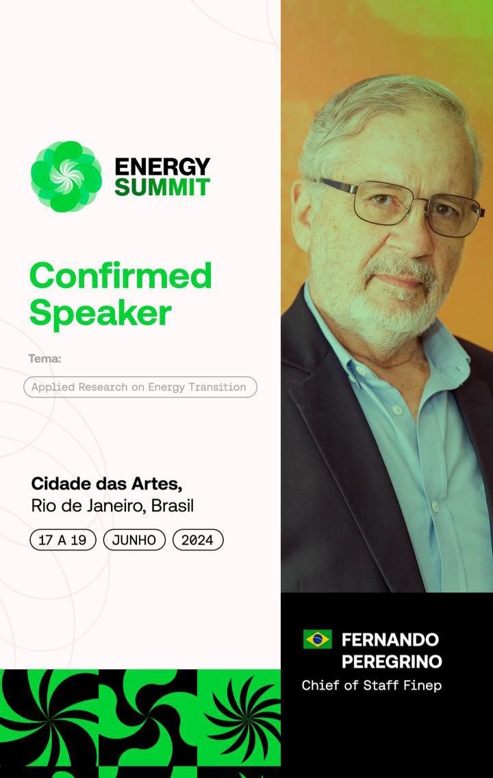 Chefe de gabinete da presidência da FINEP,  Fernando Peregrino será moderador do Painel sobre Pesquisa Aplicada em Transição Energética, no evento Energy Summit,  que acontecerá entre os dias 17 e 19 de junho,  na Cidade das Artes.