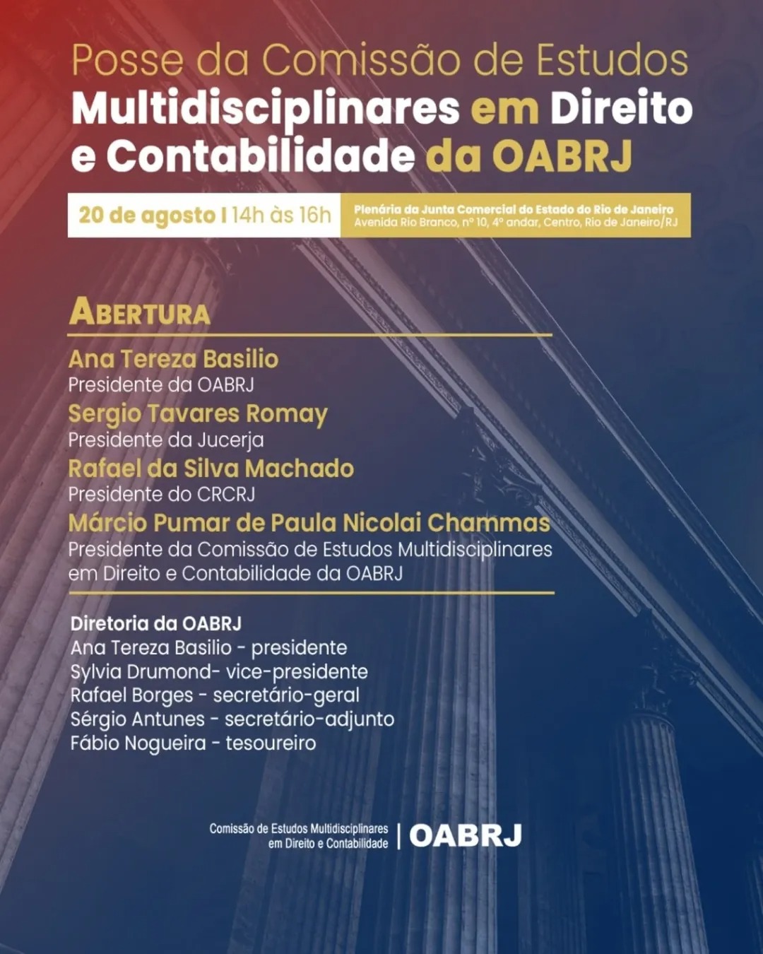 Também estarão na mesa do evento, o presidente da Junta Comercial do Estado do Rio de Janeiro (Jucerja), Sergio Tavares Romay, o presidente do Conselho Regional de Contabilidade do Rio de Janeiro (CRCRJ), Rafael da Silva Machado, e o presidente da comissão de Estudos Multidisciplinares em Direito e Contabilidade da OAB-RJ, Márcio Chammas (foto).