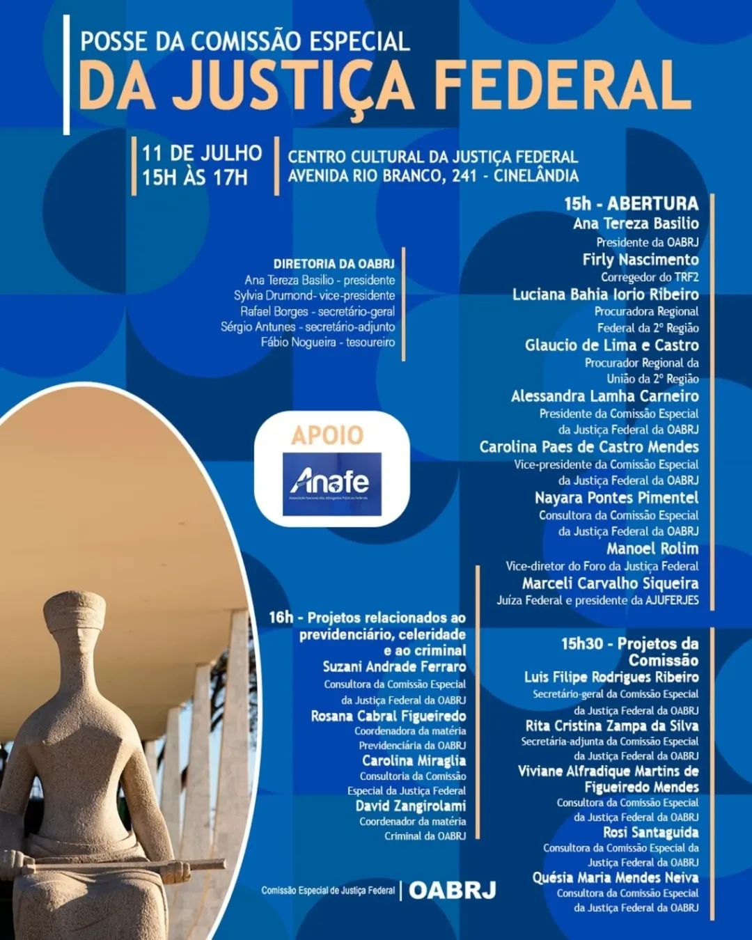 Também estarão no evento presencial, a presidente da comissão especial da Justiça Federal, Alessandra Lamha, a vice-presidente, Carolina Mendes, o corregedor do TRF-2, Firly Nascimento, a Procuradora Regional Federal da 2a Região, Luciana Bahia Ribeiro, o Procurador Regional da União da 2a Região, Glaucio Castro, entre outros convidados.