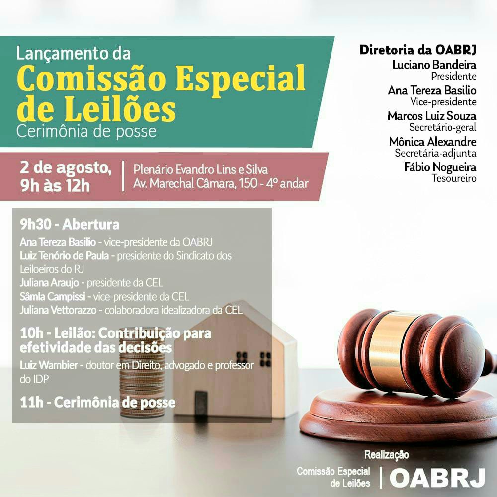Também estarão no Lançamento da Comissão Especial de Leilões, o presidente do Sindicato dos Leiloeiros do Rio de Janeiro, Luiz Tenório de Paula, a presidente da CEL, Juliana Araújo, a vice-presidente, Sâmla Campissi, e Juliana Vettorazzo( colaboradora, idealizadora da CEL).
